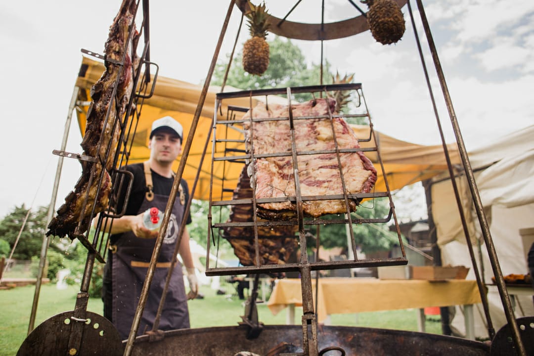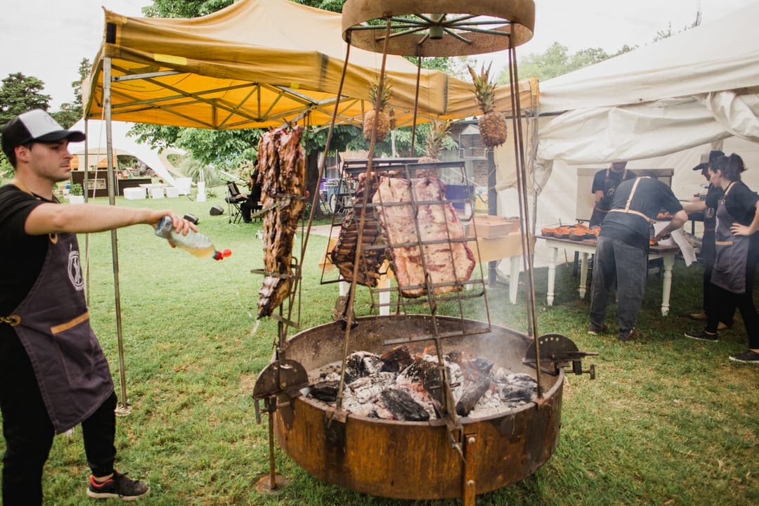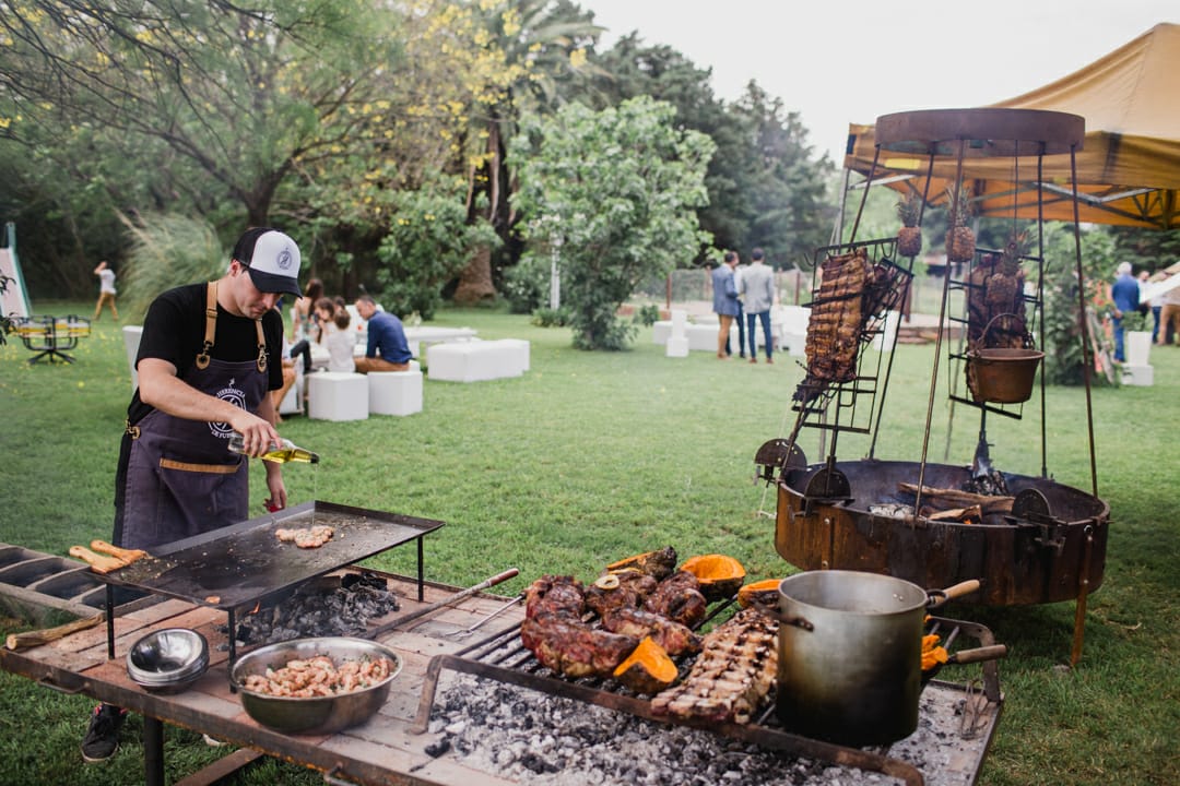 Ignacio Moyano, titular del emprendimiento, contó cómo se llevó a cabo Herencia de Fuego: "Surge por mi abuelo Walter, que me introdujo en todo este mundo de fuego y humo. El nombre lo decidimos con mi familia porque nos pareció adecuado". La empresa que cocinó para Fátima Flores y Abel Pintos, está conformada por 6 personas. Ofrecen la elección de menús a sus clientes con distintas opciones, entre las que se encuentran carnes a la llama, mariscos, empanadas y pizzas. Sus elementos están hechos a partir de materiales reciclados. El marcosjuarense viajó a Uruguay para capacitarse en el curso de 7 Fuegos Master Class, dictado por Francis Malman, considerado uno de los mejores cocineros del mundo. Allí se relacionó con personas de todo el mundo, como por ejemplo Rusia y Colombia.