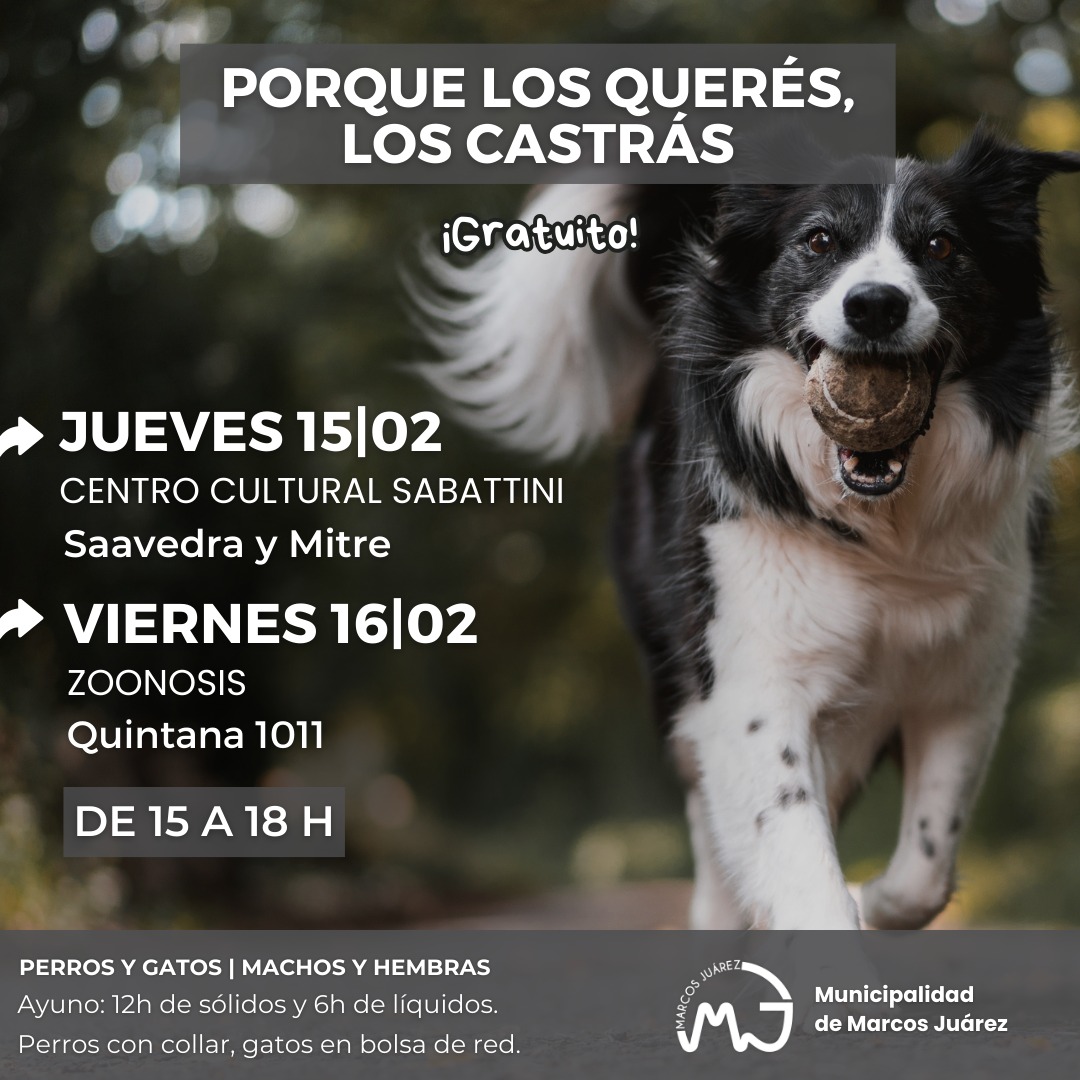 La Secretaría de Salud comunica las fechas de las próximas jornadas de castraciones masivas para perros y gatos en la ciudad, la más cercana es este jueves 15 de febrero de 15 a 18 h en el Centro Cultural Sabattini, Saavedra y Mitre.