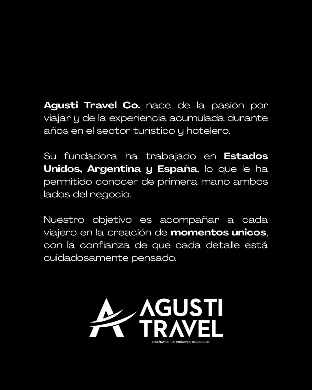 “Agusti Travel Co es una agencia de viajes que es 100% online y está adaptada por completo a las exigencias del nuevo mercado de pasajeros. La idea es acompañar al cliente desde el minuto cero, diseñando un viaje personalizado y siguiendo cada detalle en destino”, afirmó.