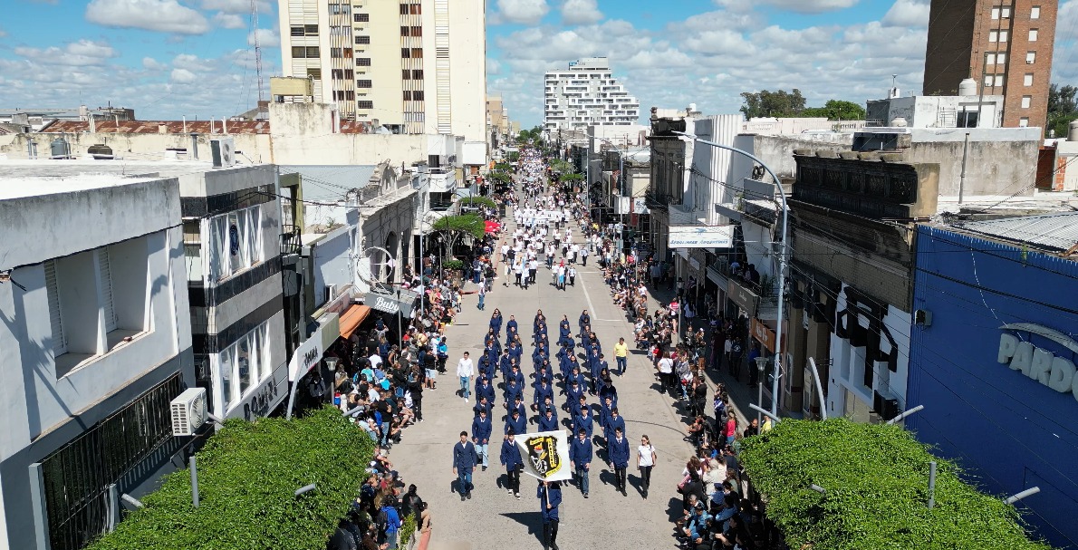 El desfile fue un espectáculo de color y alegría: los aviones del Aeroclub cruzaron el cielo, mientras la Banda Municipal “Ernesto Alfonso Bianchi” y la Orquesta Vocacional El Reencuentro pusieron música a la celebración.