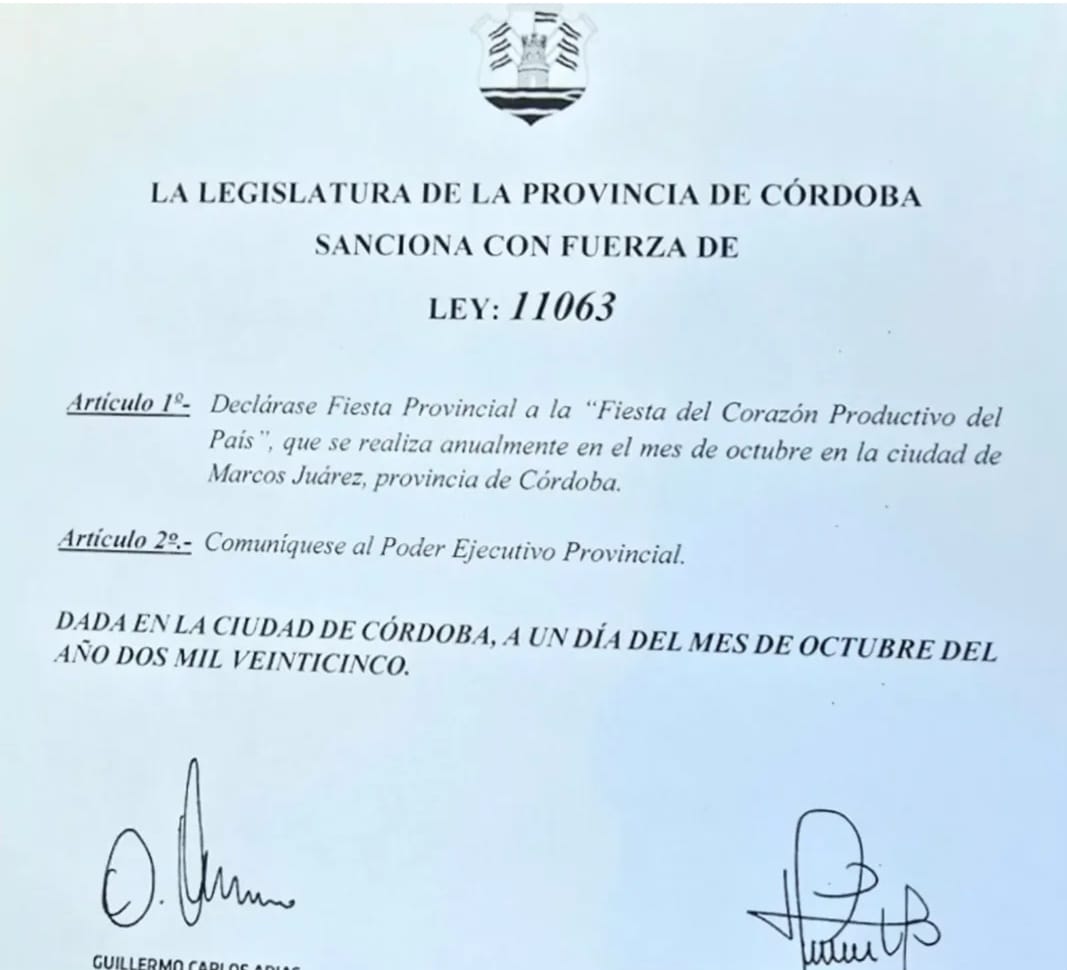 Con tratamiento sobre tablas y el voto afirmativo de todos los bloques, la Legislatura de Córdoba aprobó la Ley N° 11063, que declara a la Fiesta del Corazón Productivo del País, realizada en Marcos Juárez, como Fiesta Provincial.