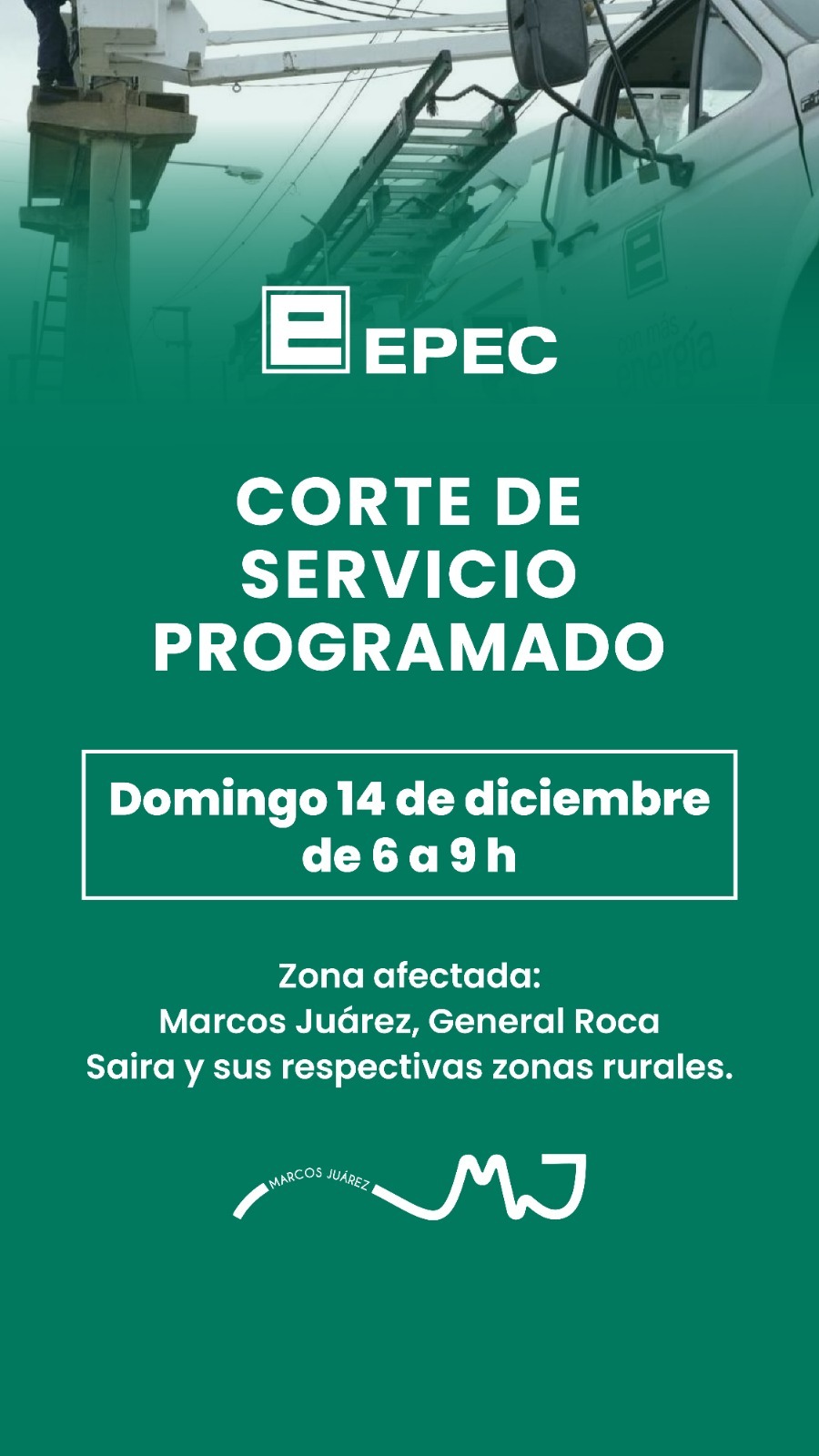 Se informa que el domingo 14 de diciembre, en el horario de 06:00 a 09:00, se llevará a cabo un corte programado de suministro eléctrico (cero tensión) que afectará a toda la ciudad de Marcos Juárez, General Roca, Saira y sus respectivas zonas rurales.