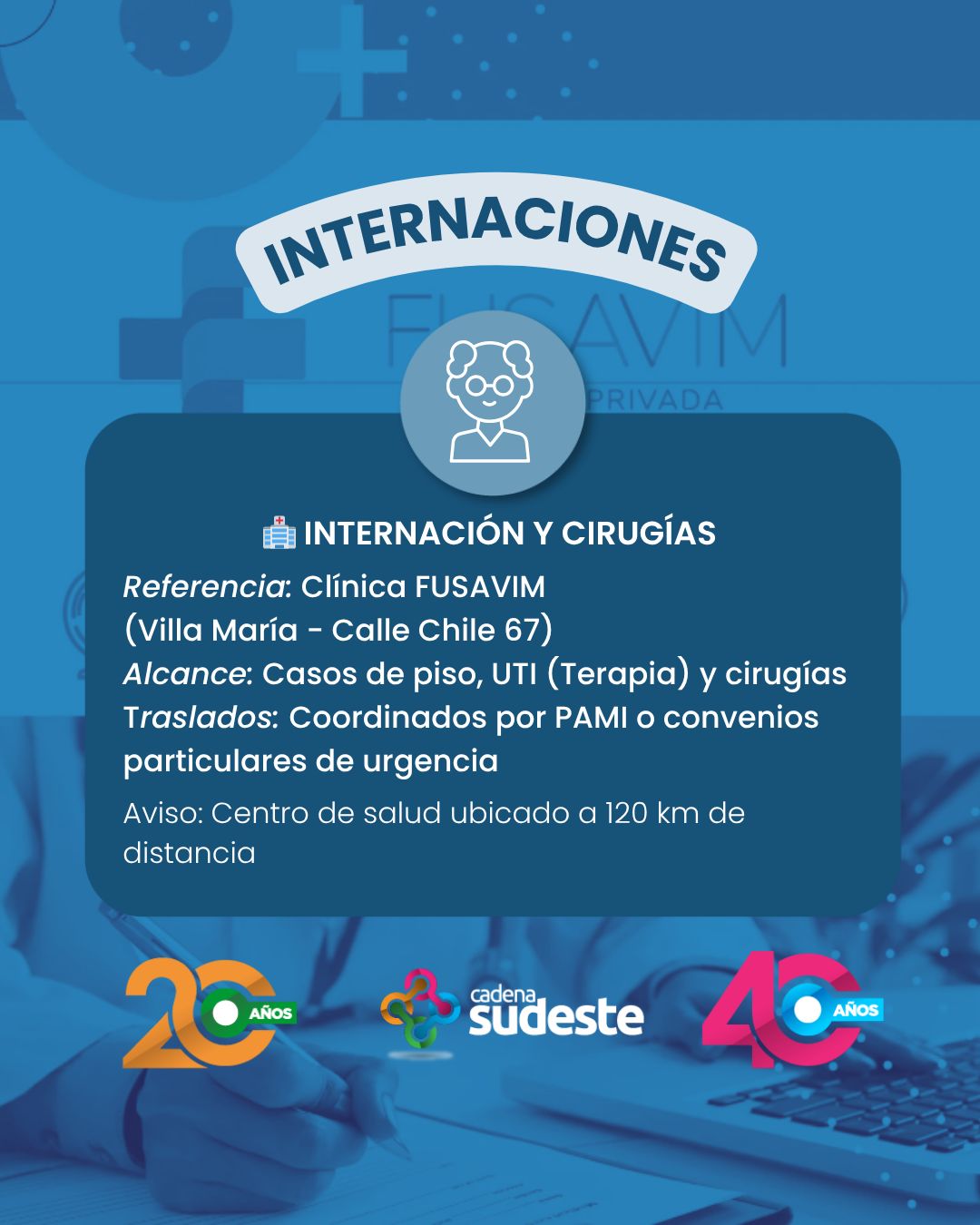 Uno de los puntos más sensibles del nuevo esquema es la resolución de casos que requieren internación o intervenciones quirúrgicas. En estas situaciones, los pacientes serán derivados a la Clínica FUSAVIM, en la ciudad de Villa María, ubicada a aproximadamente 120 kilómetros. Los traslados estarán a cargo de PAMI o de convenios particulares en situaciones de urgencia.