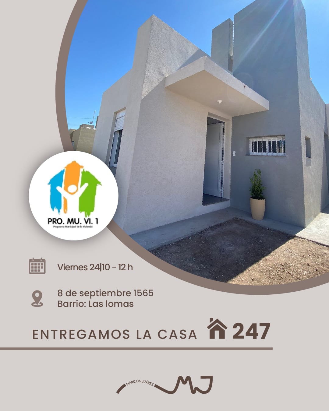 El próximo viernes 24 de octubre a las 12 horas se llevará a cabo la entrega de la vivienda Nº 247 del Programa Municipal de Vivienda (PRO.MU.VI.).