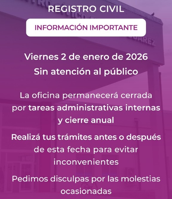 La Municipalidad de Marcos Juárez informó que el próximo viernes 2 de enero no habrá atención al público en el Registro Civil de la ciudad, debido a la realización de tareas internas administrativas previstas para esa jornada.