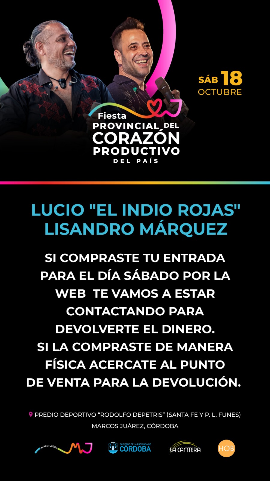 Por este motivo, se informó que se devolverá el dinero a todas las personas que ya habían adquirido sus entradas para esa jornada, en la que se presentarán Lucio “El Indio” Rojas y Lisandro Márquez.
