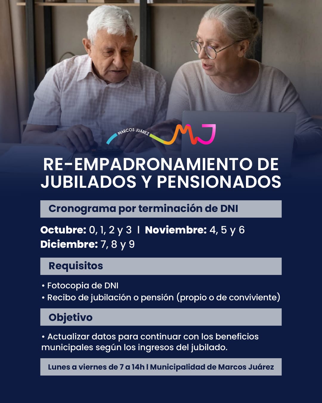 La Municipalidad de Marcos Juárez informa que durante los meses de octubre, noviembre y diciembre se llevará a cabo el re-empadronamiento de jubilados y pensionados del municipio.