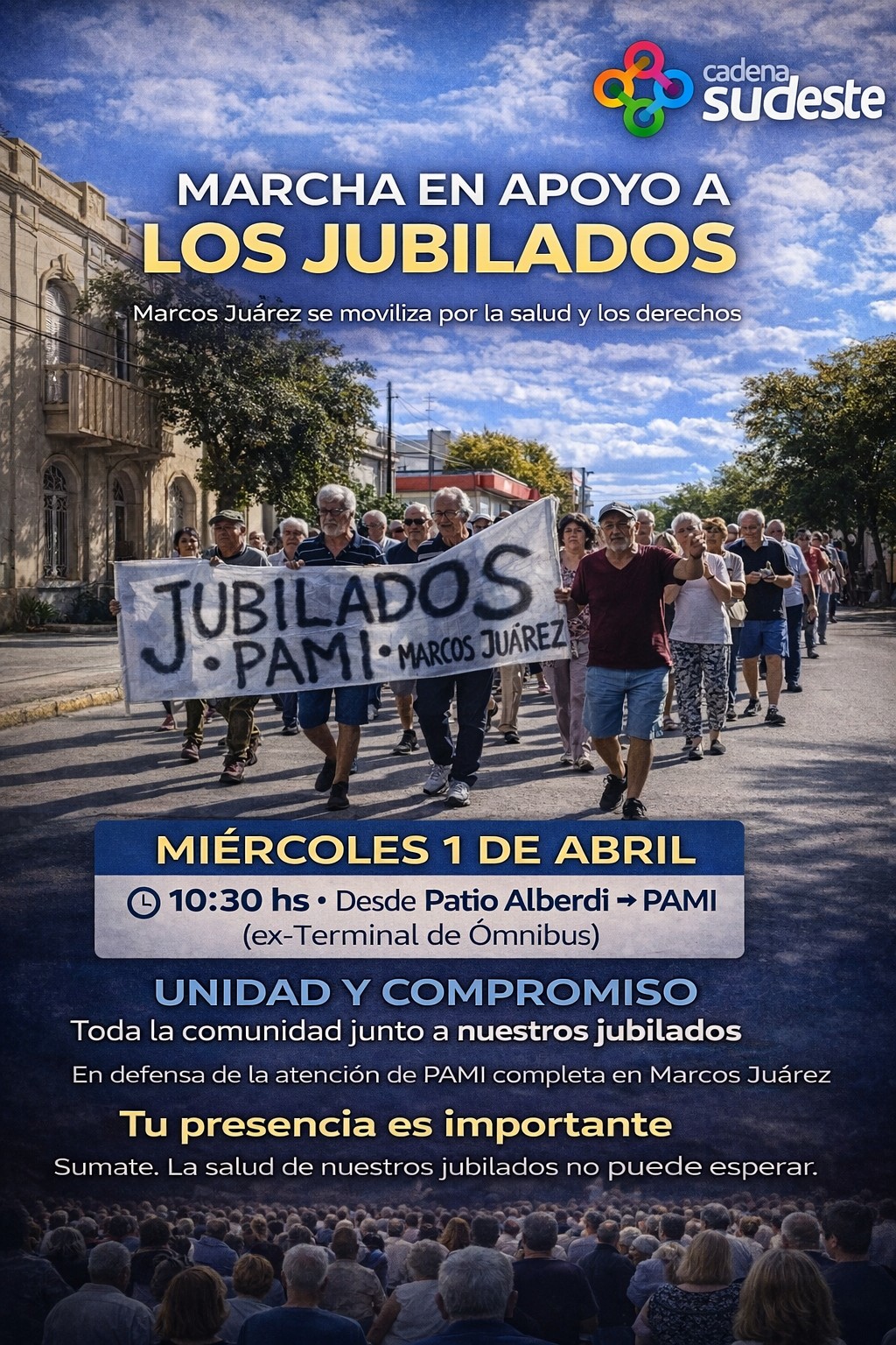 UNIDAD Y COMPROMISO: TODA LA COMUNIDAD JUNTO A NUESTROS JUBILADOS EN DEFENSA DE SUS DERECHOS ESENCIALES La comunidad de Marcos Juárez atraviesa un momento clave que requiere del compromiso colectivo, la sensibilidad social y la participación activa de cada vecino y vecina. Esta movilización no es solo un acto de reclamo, sino una expresión de solidaridad, justicia y defensa de derechos fundamentales que no pueden ser vulnerados. Es indispensable que este llamado trascienda lo individual y se transforme en una causa colectiva. La salud de nuestros adultos mayores no puede quedar relegada ni sujeta a decisiones que los desprotejan. Asimismo, se hace un especial y enfático llamado a la dirigencia política, en todos sus niveles y espacios, para que se sume activamente a este reclamo. Es momento de demostrar con hechos el compromiso con la comunidad, acompañando, gestionando y defendiendo los derechos de los jubilados. La política debe estar a la altura de las circunstancias, escuchando y actuando en favor del bienestar común. La participación de todos es fundamental. Hoy más que nunca, la unidad de la comunidad será la herramienta más poderosa para exigir respuestas y garantizar el acceso a una atención de salud digna y completa para nuestros jubilados.Por este motivo, se convoca a toda la comunidad a hacerse presente este miércoles 1 de abril a las 10:30, partiendo desde el Patio Alberdi hacia la sede local del PAMI, actualmente ubicada en la antigua estación de ómnibus