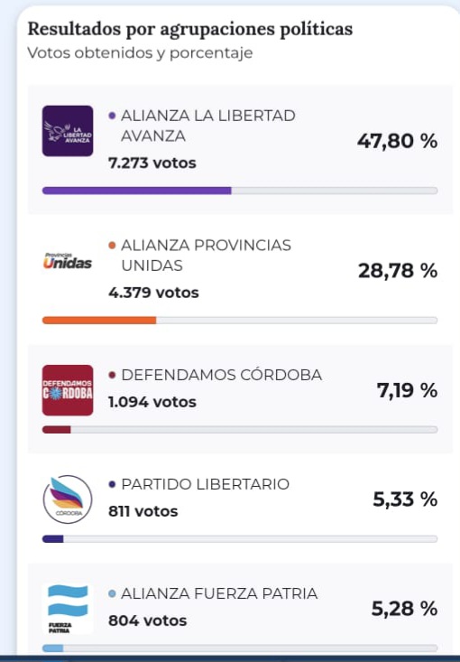 En segundo lugar quedó Provincias Unidas, espacio vinculado al exgobernador Juan Schiaretti, que logró 4.379 votos, equivalente a más del 28%. La diferencia entre ambas fuerzas refleja un marcado apoyo al espacio libertario en la ciudad.