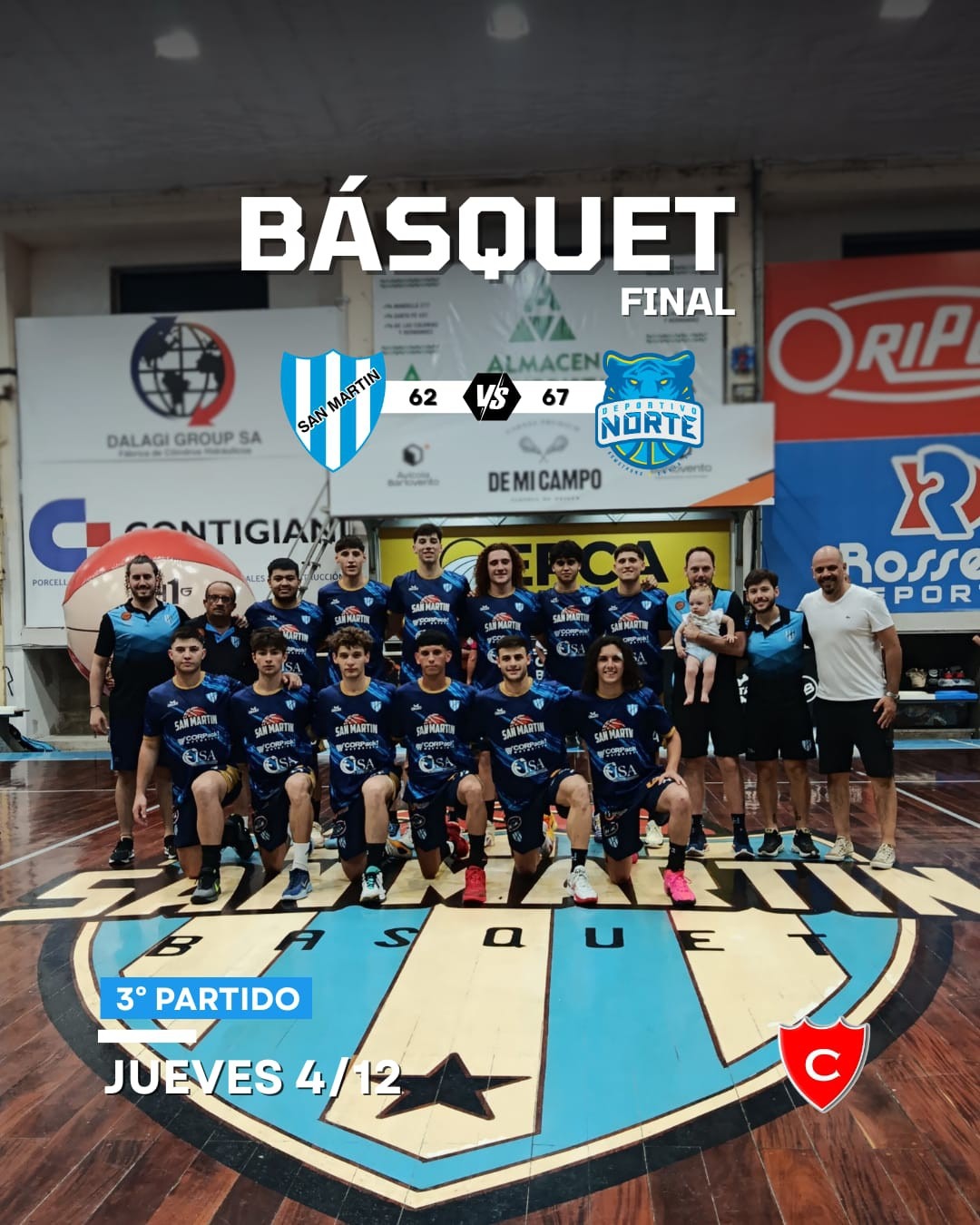 En el Estadio Leonardo Gutiérrez, Deportivo Norte de Armstrong venció a San Martín de Marcos Juárez por 67 a 62 en el Juego 3 de la serie final de la Asociación Cañadense, quedando 2–1 arriba y a un solo paso del título.