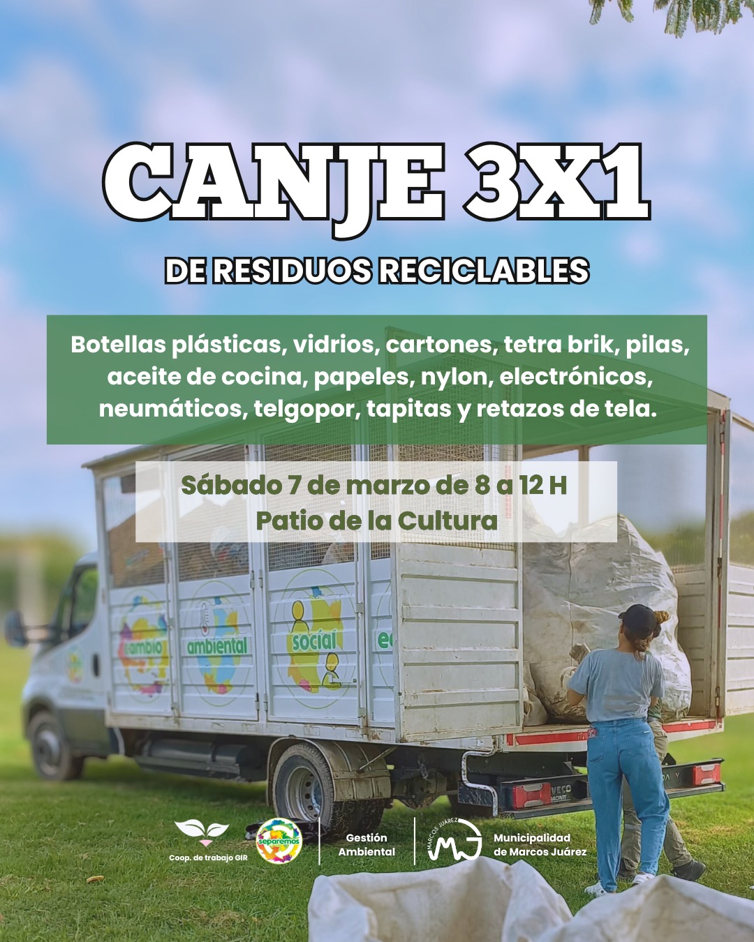 La Municipalidad de Marcos Juárez informa que el próximo sábado 7 de marzo, de 8 a 13 horas, se realizará un nuevo Canje 3×1 en el Patio de la Cultura.