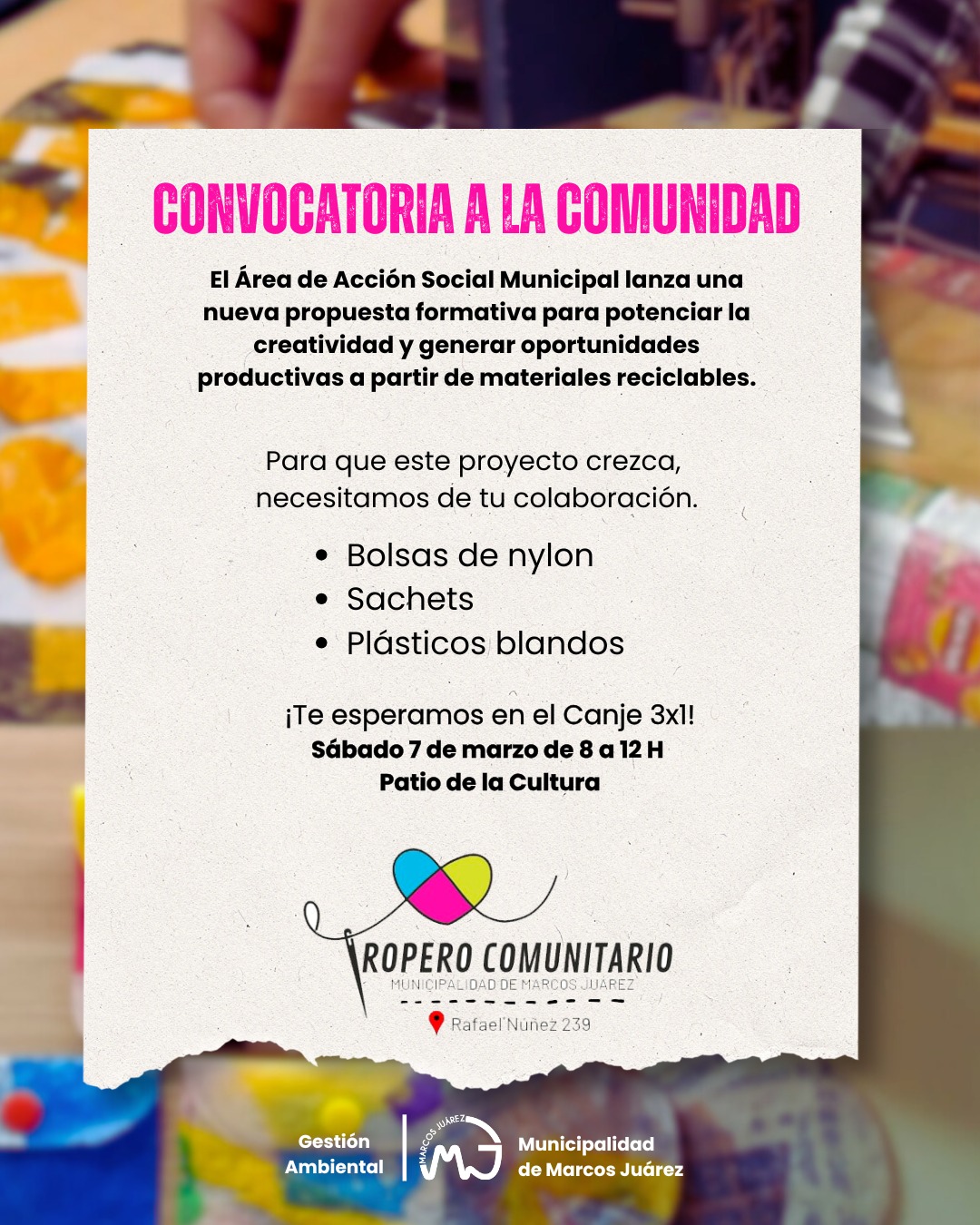 Además, el Área de Acción Social invita a la comunidad a colaborar con bolsas de nylon, sachets y plásticos blandos, con el objetivo de potenciar la creatividad y generar oportunidades productivas para quienes forman parte del Ropero Comunitario.