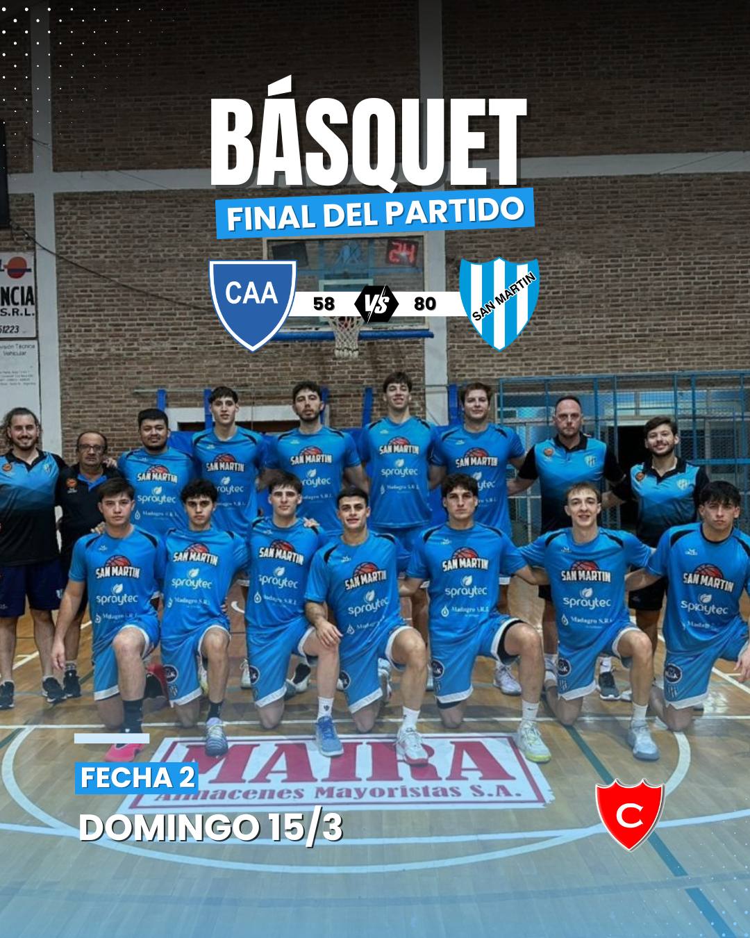 El equipo ratificó su buen momento colectivo con una actuación convincente, dominando el juego de principio a fin y mostrando una identidad cada vez más clara dentro de la cancha. Desde el arranque, el “Gaucho” impuso condiciones con un juego ordenado y efectivo, destacándose la conducción de Ignacio “Nacho” Cuesta y Nicolás Eydallin, quienes manejaron los tiempos del partido con inteligencia y precisión. A esto se sumó el aporte clave en ofensiva de Germán Molina y Juan Ignacio Dassie, este último mostrando una adaptación cada vez más notoria al funcionamiento del equipo, convirtiéndose en una pieza importante en el andamiaje ofensivo. Otro aspecto positivo fue la rotación del plantel implementada por el entrenador Esteban Pierdominici, quien aprovechó el desarrollo del encuentro para darle minutos a todos los jugadores. Esta decisión no solo permitió mantener la intensidad durante los cuatro cuartos, sino también fortalecer el compromiso y la confianza de cada integrante del equipo. El rendimiento colectivo fue uno de los puntos más altos de la noche, con varios jugadores sumando en el goleo y en las distintas facetas del juego. La defensa firme y las transiciones rápidas fueron claves para ampliar la diferencia y cerrar el partido con tranquilidad. Síntesis de San Martín: Con este triunfo, San Martín continúa por la senda positiva y llega con confianza a su próximo desafío. La invitación está hecha: acompañar al “Cele” y seguir alentando a este equipo que ilusiona y no para de crecer.San Martín volvió a demostrar su gran presente en el torneo de la Cañadense, logrando una sólida victoria como visitante frente a Almafuerte de Las Rosas por 80 a 58.